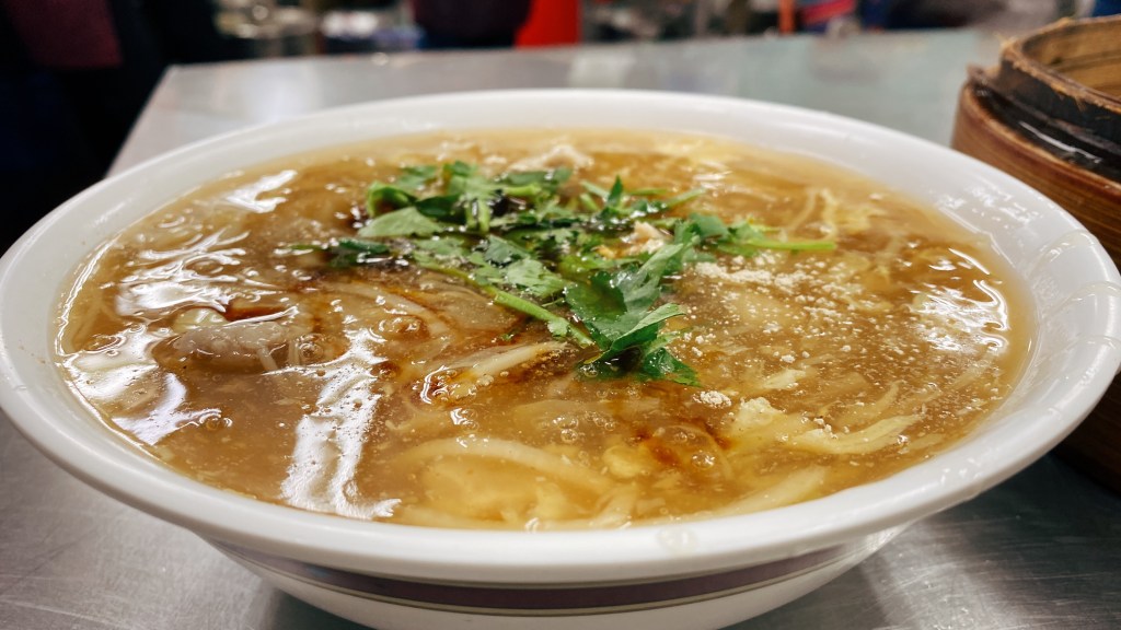 蒸餃一籠8顆,顆顆飽滿、皮Q又內餡紮實,一咬下去肉餡燙口還帶著湯汁──但如果不喜韭菜的吃友們可能就要斟酌一下了──再配上一碗香氣撲鼻的肉羹米粉、或肉羹飯,肚子與心靈的滿足感立刻增加暴增。