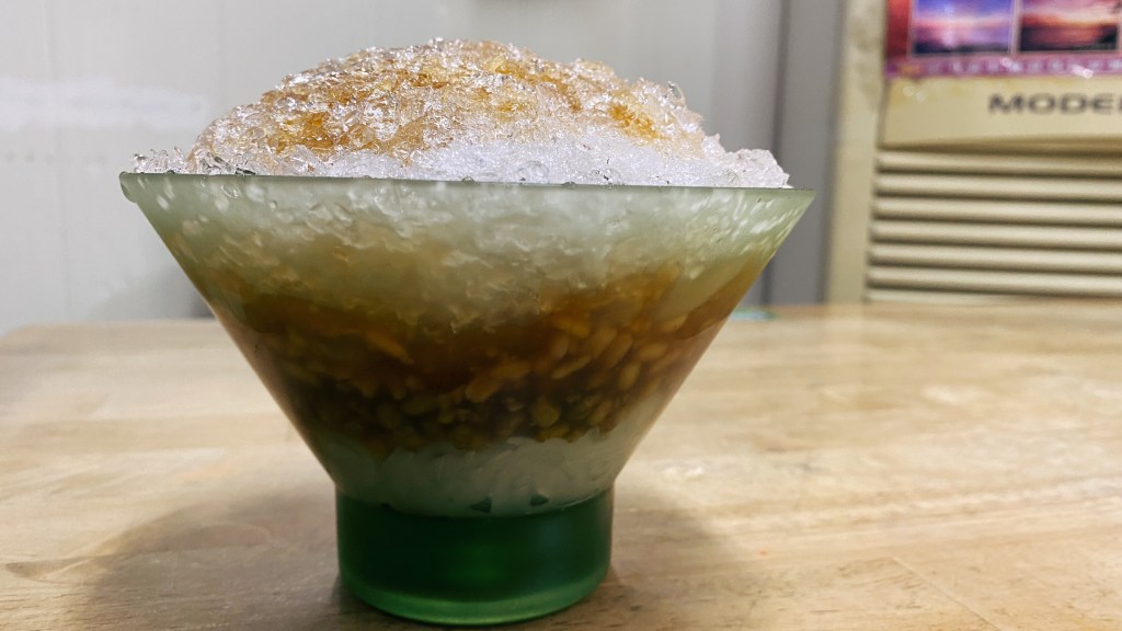 綠豆蒜其實就是脫殼後的綠豆仁,據說長相與大蒜相似才有此名。恆春老街上賣綠豆蒜的店面不少,但阿伯綠豆饌就光顧了兩次,一碗上來,清澈的冰隱約可見綠豆蒜與其他的料,先舀出底下的料吃一口,細細品嘗綠豆蒜的口感,再把料一邊撈上來澆在冰上,讓整碗的溫度平均,就可以大口吃了!